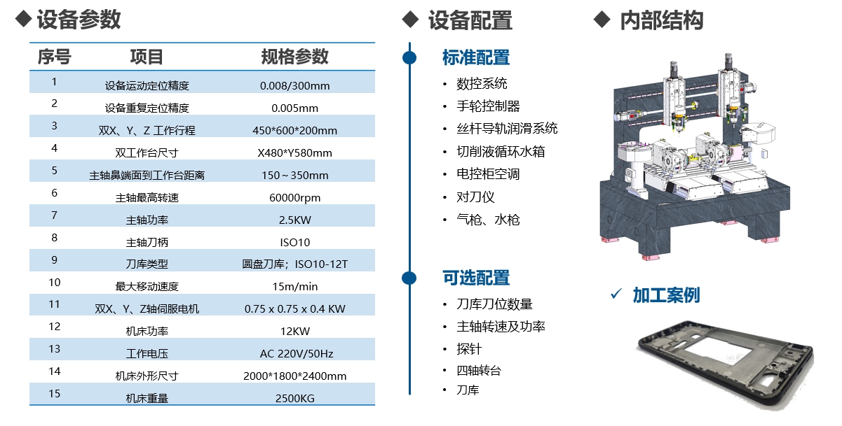 备刀库、第四轴、探针,实现在线定位补偿、换刀等复杂的加工工艺。