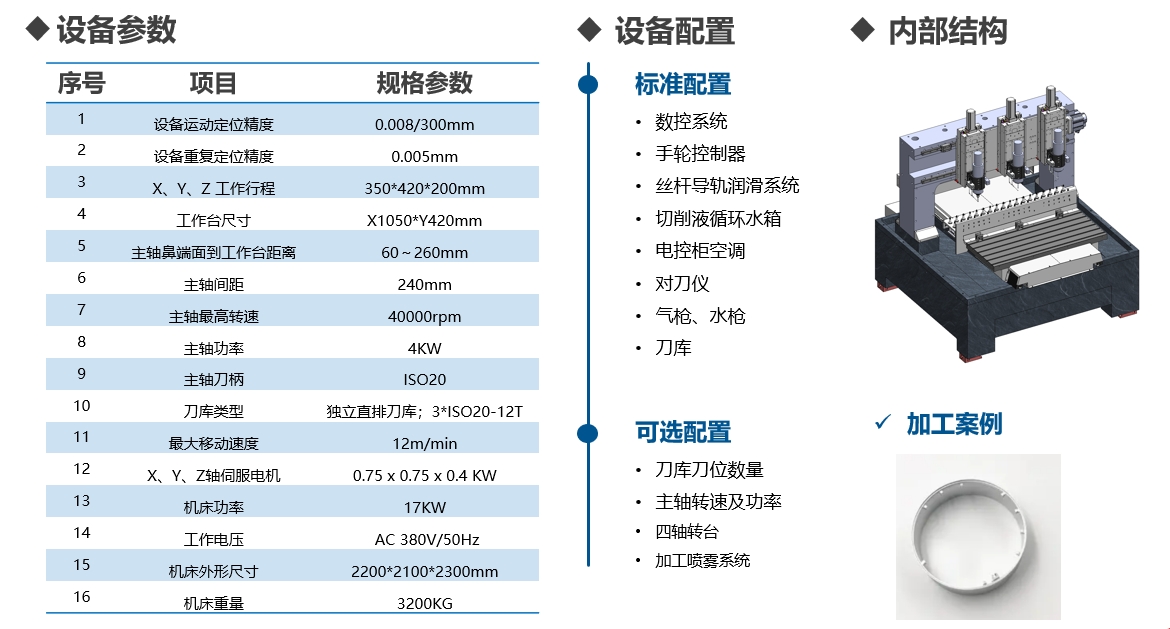 可同时加工三件产品,三个Z轴独立伺服控制,每个Z轴可单独智能修补刀具的位置偏差,有效提高工件的一致性;三主轴的设计,成倍的提升了加工效率。